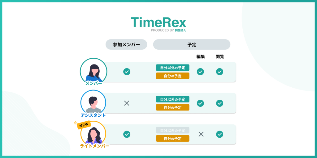 ※1:ライトメンバー権限は日程調整カレンダーの作成・編集ができないため、他の権限のチームメンバーによって参加メンバーに設定される必要があります